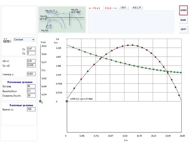 Во время моделирования мы воспользовались программой lane117b, с помощью которой нам удалось найти зависимость высоты и дальности полета, времени полета, скорости в высшей точке от массы, площади сферы, начальной скорости и начального угла к горизонту. Lane — это компьютерная программа, предназначенная для моделирования траекторий движения различных летательных аппаратов (планеров, аэросатов, ракет и т.д.) и баллистических тел (пуль, мячей, снарядов и т.д).Программа является универсальной и состоит из ядра, в котором осуществляются интегрирование уравнений движения, интерфейса пользователя, позволяющего задавать аэродинамические, массовые и геометрические данные исследуемых аппаратов, начальные и граничные условия, а также графический интерфейс. При расчетах используется модель атмосферы «Атмосфера стандартная по международному стандарту ИСО 2533» и стандартные параметры футбольного мяча.