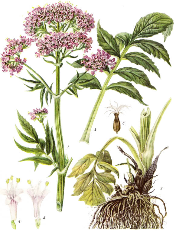 Многолетнее травянистое растение высотой до 2 м. Стебель прямостоячий, полый, ветвящийся в верхней части Листья супротивные, простые перисторассечённые, по краю пильчатые. Нижние листья черешковые, верхние – сидячие. Цветки мелкие. бледно-розовые, собраны в щитковидные соцветия. Плод – семянка. Почти повсеместно по влажным местам.Культивируется Заготовка ведётся после созревания плодов. Выкапывают, отряхивают, промывают, 1-2 дня провяливают на воздухе, затем сушат при температуре не выше 35-40оС. Сырьём являются короткие конические корневища с рыхлой или полой сердцевиной, от которых отходят многочисленные придаточные корни, тонкие, ломкие. Цвет коричневый, на изломе желтоватый. Запах сильный, специфический. Вкус пряно-горький Эфирные масла (группа бициклические монотерпеноиды), флавоноиды, иридоиды, алкалоиды и др. Сырьё валерианы оказывает успокаивающее, спазмолитическое, желчегонное и др. виды действия. Готовят настой, входит в состав сборов. Настойка, экстракт, комплексные препараты применяются при эмоциональном возбуждении, бессоннице, в начальной стадии гипертонии, при кардионеврозе, при неврозах ЖКТ. при метеоризме т.д. («Валоседан», «Валокармид», «Ново-пассит», «Персен», «Саносон» и др.)