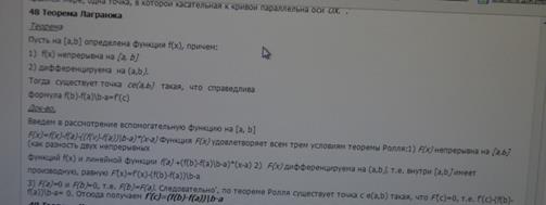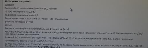 Пусть производная некоторой функции f дифференцируема. Тогда производная от производной этой функции называется второй производной функции f и обозначается f". Таким образом, f" (x) = (f' (x)) '. Если дифференцируема (n - 1)-я производная функции f, то ее n -й производной называется производная от (n - 1)-й производной функции f и обозначается f(n). Итак, f(n) (x) = (f(n-1) (x)) ', n ϵ N, f(0) (x) = f (x). Число n называется порядком производной. Дифференциалом n -го порядка функции f называется дифференциал от дифференциала (n - 1)-го порядка этой же функции. Таким образом, dnf (x) = d (dn -1 f (x)), d 0 f (x) = f (x), n ϵ N. Если x - независимая переменная, то dx = const и d 2 x = d 3 x =... = dnx = 0. В этом случае справедлива формула dnf (x) = f (n)(x)(dx) n. 37.Теоремы Роля и Лагранжа.(?)