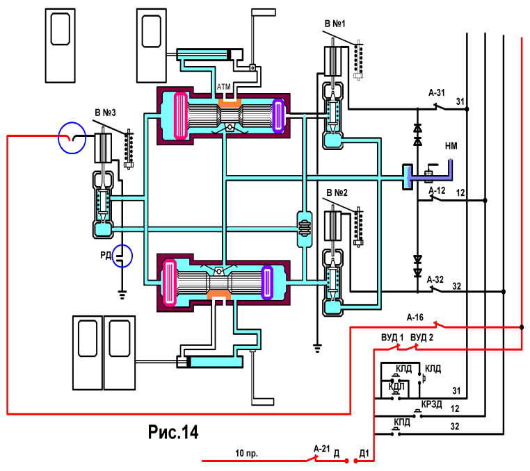 Причины: а) Обрыв в цепи 16 -го вагонного провода, б) Разомкнутая (неисправная), нормально-замкнутая блокировка РД при открытых дверях (Рис.14).