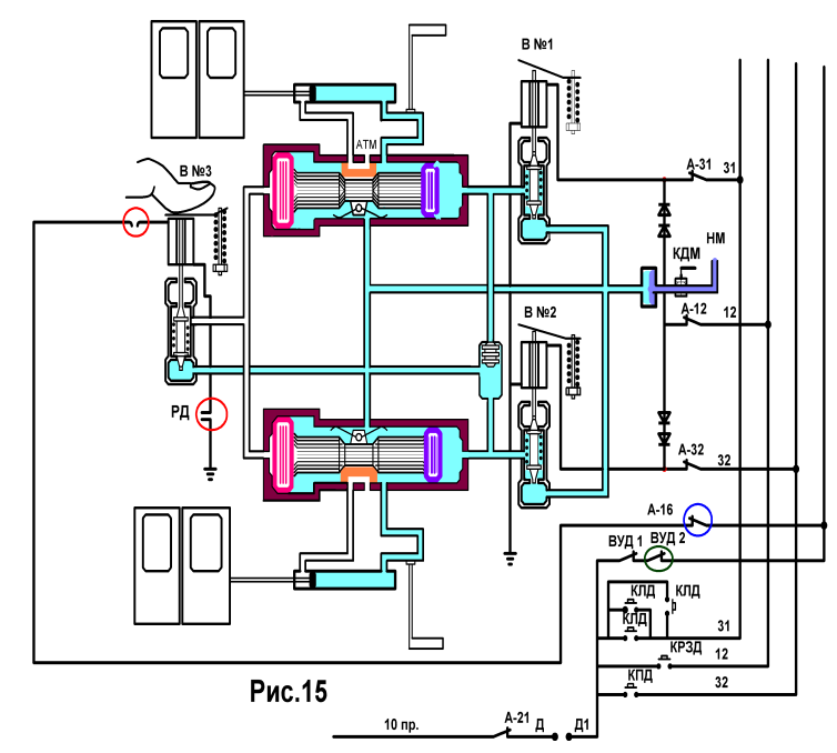 а) Высаживает пассажиров из вагона, б) Закрывает двери, нажатием на вентиль №3 пальцем руки (Рис.15), в) Отключает А-31 или А-32 для того, чтобы после прибытия в головную кабину и открытия дверей в поезде для высадки пассажиров, в неисп- равном вагоне не открылись двери.(Рис.15) г) Вручную раздвигает дверной проём, выходит из вагона и следует в кабину управления, д) Открывает двери и высаживает пассажиров из поезда, е) Докладывает ДЦХ, ж) По сигналу дежурной по станции закрывает двери в поезде,