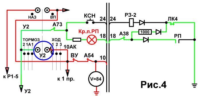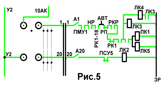 Отсутствие напряжения на проводе У2 не приведёт к включению ЛК2 по 20 -му проводу и включению блокировки ЛК-2 в це- пи ЛК1, ЛК3, ЛК5 и ЛК4 в 1 -м проводе, т.е. к не сбору схемы управления.(Рис.5)