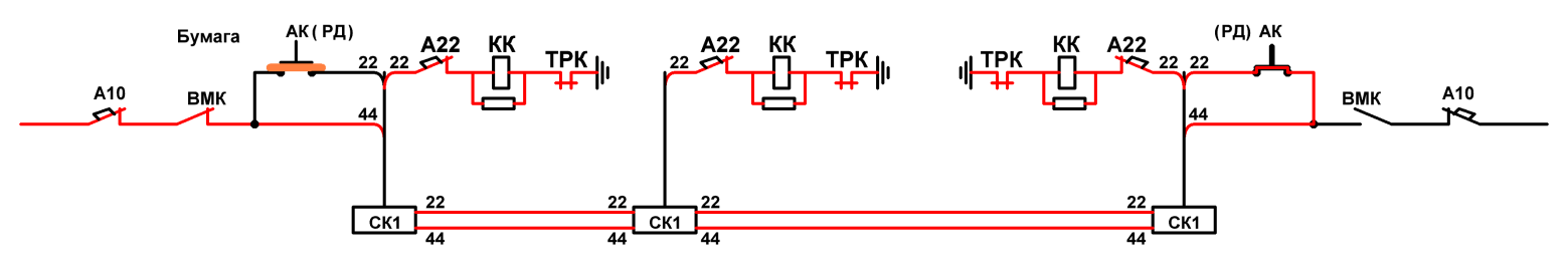 Цепь включения контакторов компрессоров: 10 провод, А10, ВМК, синхронизирующий 44-й провод, СК1, поездной 44-й провод, 44-й провод хвостового вагона, включённый РД, 22-й провод и в каждом вагоне 22-й провод, А-22, КК, контакт ТРК,,, земля ’’.