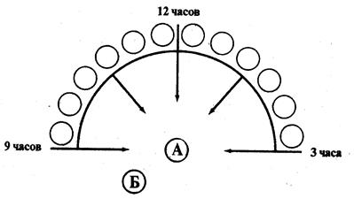 На рисунке представлена наиболее распространенная полукружная позиция (180-градусная дуга, или верхняя половина циферблата часов), которую занимают члены группы, ожидающие своей очереди приветствовать вернувшуюся душу А с Гидом (или без него), находящимся в позиции Б. Обычно приветствующие души не выходят из-за спины души А, а выступают вперед по направлению стрелок, как показано на рисунке, каждая по порядку.
