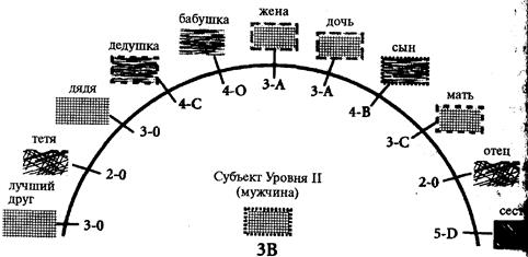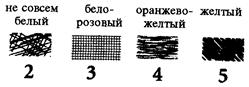 Рис. 7. Цвета энергии членов первичной группы душ Эта таблица указывает на воплощенных родственников и одного друга Субъекта 3-Б. Пронумерованные ячейки 2, 3, 4 и 5 - указывают на первичный основной цвет. Буквенные обозначения А, Б, В и Г - являются вторичными оттенками сияния каждого члена группы. Находясь в состоянии гипноза, этот Субъект (ЗБ) смотрит на одиннадцать душ из своей изначальной группы, которая состоит из членов его нынешней семьи в этой жизни плюс его лучший друг. У его сестры основ ной цвет — почти темно-желтый, потому что она перемещается на Уровень III. Если бы у нее еще был силен защитный аспект желтого вместо синего (знание), которым она в действительности располагала, то моему Субъекту было бы труднее характеризовать ее, основываясь лишь на цвете, потому что ее гало и основной цвет были бы очень похожими. Не считая сестры Субъекта, родители его родителей, а также сын, как свидетельствует рисунок, представляются несколько более продвинуты ми, чем другие члены семьи, в то время как его отец и тетя — несколько менее продвинуты. Дед и мать в этой семье являются Целителями. Заметьте, что почти половина группы не имеет дополнительных гало-цветов. Мне достаточно часто приходилось сталкиваться со случаями, когда группах вообще нет гало. Ярко-красный цвет гало моего Субъекта над основной массой его энергии белого и красновато-розового цвета указывает на его горячую, сильную натуру. Его сын в этой жизни имеет похожие черты поведения. Его дочь не склонна к критическим суждениям и очень духовна. Когда я попросил этого Субъекта высказать свое мнение относительно красного цвета в его энергии, он ответил следующее: «Из-за моей горячей натуры у меня бывают проблемы с гневом. Я часто выбираю тела, которые эмоционально легко возбудимы, потому что они соответствуют моему характеру. Я не люблю пассивные тела. Мой Гид не возражает против моего выбора, потому что, как она говорит, я научусь контролировать себя, расслабляяум вэтих телах. Такого рода контроль не прост из-за моих импульсивных реакций и страсти в сложных ситуациях. Во многих своих прошлых жизнях на протяжении веков я учился этому и добился некоторых успехов в самодисциплине. В прошлом я слишком легко впадал в агрессивное состояние, и теперь это положение дел потихоньку меняется. Я также получаю помощь и поддержку от моей родственной души (теперешней жены)». Иногда я сталкиваюсь с душами, у которых развитие протекает с отклонениями. Это становится особенно очевидным для меня, когда пациенты начинают описывать души, чей основной цвет несколько выбивается из общей палитры всей группы. Примером могут быть более молодые души, у которых преобладает белый цвет. В следующем Случае рассматривается группа душ, находящихся на Уровне от III до IV.? только что закончил просматривать вместе с Субъектом всех членов группы, излучающих желто-голубые цвета, и тут Субъект упомянула о стоящей рядом с ней душе, которая была преимущественно белой.