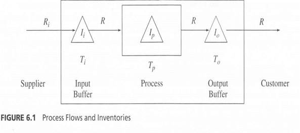 В зависимости от расположения запасов в процессе, мы можем классифицировать единицы запасов на три категории: 1. Единицы потока, ожидающие начала обработки (входные запасы). 2. Единицы потока, которые находятся на стадии обработки (запасы процесса). 3. Обработанные единицы потока, которые еще не вышли за границы процесса (выходные запасы). Мы начнем с введения следующих обозначений: Average input inventory = Ii Average in-process inventory = Ip Average output inventory = Io Тогда, средний общий запас I, который находится в границах процесса: I = I{ + Ip + I0 Единица потока, двигаясь через процесс, будет проводить некоторое время в каждом из трех видов запасов. Средние значения этих времен ожидания обозначаются следующим образом: Average time spent in input inventory = Tj Average time spent in in-process inventory = Tp Average time spent in output inventory = To Суммарное среднее время потока равно: T = Ti + Tp + To Закон Литтла также может быть применен к каждому из этапов, чтобы установить связь между скоростью потока в равновесии и соответствующим средним запасом и средним временем потока на каждом этапе