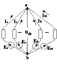 В схеме все ЭДС направлены в одну сторону от b к a и положительное направление тока совпадает с направлением ЭДС ветви. Если какая - либо ЭДС направлена противоположно, то есть к узлу b, то это значение берется со знаком минус. По 1 правилу Кирхгофа сумма токов в узле равна 0.