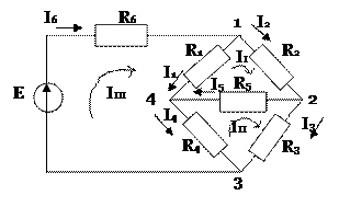 Метод контурных токов применяется для расчета линейной цепи. Он позволяет уменьшить количество исходных уравнений до числа независимых контуров. Независимые контуры выбираются также как и при применении законов Кирхгофа. 1241: (R1 + R2 + R5)II - R5III = 0. 2342: (R3 + R4 + R5)III - R5II = 0. 143E1: (R1 + R4 + R6)IIII - R1II - R4III = 0. I6 = IIII. I2 = II. I3 = III. I1 = IIII - II. I4 = IIII - III. I5 = II - III.