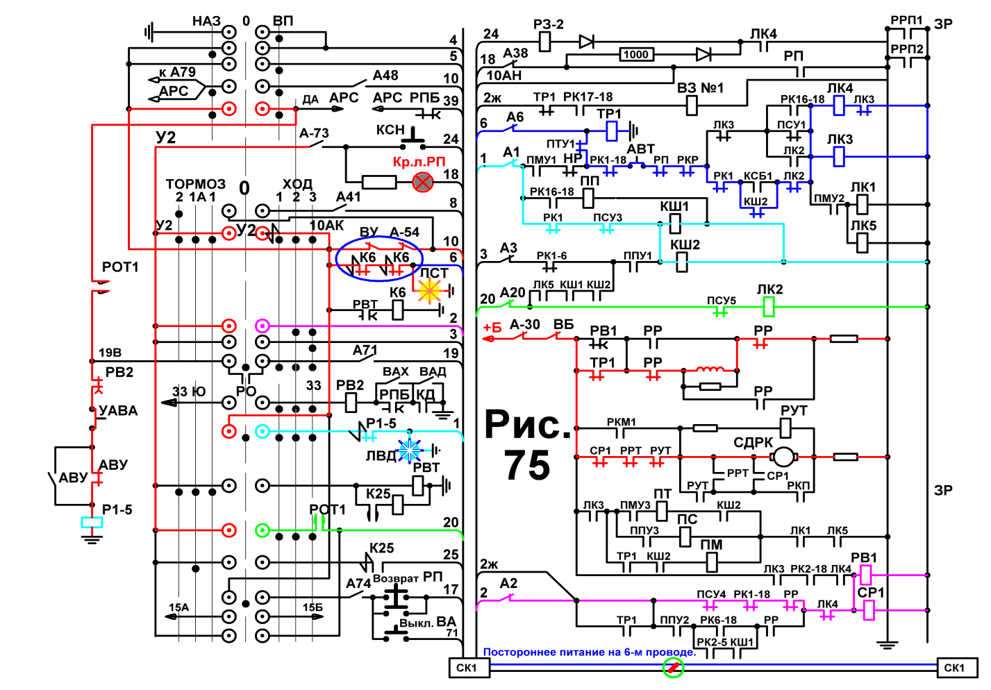б) Постороннее питание на 6-м поездном проводе. (Рис.75)