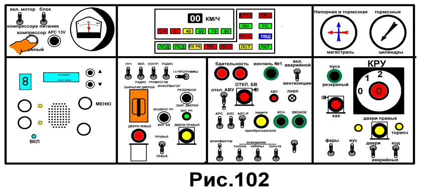 Действия машиниста: 1. Докладывает ДЦХ о неисправ- ности, 2. С пассажирами следует до де- повской станции, далее в депо. В пути следования пользуется резервной кнопкой М/К (КРМК) (Рис.102,103,104)