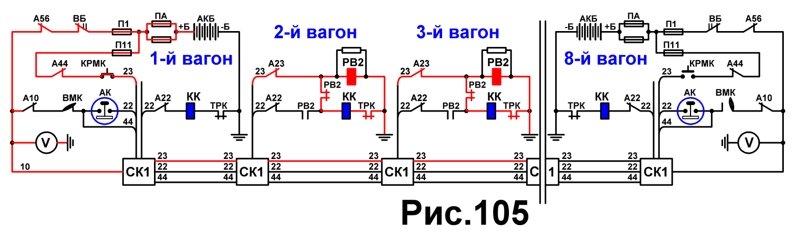 +Б, ПА, П11, А44, КРМК, 23 -й провод, СК1, 23 -й поездной провод, СК1 и в каждый вагон, кроме головного и хвостового, А23, реле РВ2,,, земля ’’. (Рис.103) Реле РВ2 включается, размыкая свой контакт в цепи 22 -го провода и замыкает в цепи 23 -го провода. Таким образом катушка контактора КК продолжает получать питание от 23 -го провода по цепи: 23 провод, замкнутый контакт РВ2, катушка КК, ТРК,,, земля ’’. (Рис.104) б) А-10 — не выбит.