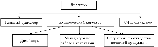 Рис.7. Организационная структура предприятия Таким образом, можно сделать вывод, что организационная структура УП «Деловая инициатива» является иерархической линейной структурой управления, что обычно характерно для малых предприятий. В организации отсутствует материальное стимулирование работников. Существует также проблема текучести кадров, в частности среди дизайнеров и менеджеров по работе с клиентами, ввиду сравнительно невысокой оплаты труда. Несмотря на это нельзя сказать, что мотивация на предприятии отсутствует совсем. Благодаря малому количеству персонала руководители имеют личный контакт со всеми сотрудниками и являются для них авторитетом, что следует считать мотивационным фактором. Также стоит отметить, что работа, выполняемая сотрудниками предприятия, не однообразна и требует различных навыков и знаний, что повышает их самооценку. Это можно считать моральным фактором, повышающим результативность труда работников. Для предприятия характерны неофициальные отношения «запросто» между всеми сотрудниками, включая и руководителей. В качестве недостатка подобного положения вещей можно указать, что такие отношения нередко приводят к отсутствию субординации, что может снизить эффективность деятельности организации. Производство Благодаря тому, что с поставщиками материалов установлены благоприятные и долгосрочные связи предприятие приобретает сырье по доступным ценам. На большинство материалов организации предоставляются скидки от 15 до 30%. Коммерческий директор постоянно отслеживает наличие материалов на складе и в случае приближения к установленному резерву, формирует заявки поставщикам для пополнения запасов. Предприятие располагается Все предприятие располагается в четырех комнатах офисного типа, одна из которых приспособлена под хранение запасов (площадь 20 м.кв.), две заняты под офис (25 и 17 м.кв), а четвертая фактически и является производственным помещением, размер которой составляет 40 м.кв. В собственности УП «Деловая инициатива» имеется следующего оборудование: § 11 персональных компьютеров § 2 лазерных принтера НР 1200. § Сканер Umax Powerlook III § 3 Полноцветных цифровых аппарата: Xerox DocuColor 12, Fiery XP12 и Canon СР 660 § Ризограф GR 3750 § Двухкрасочный тампостанок TIC § Плоттер EnCad NOVAJET Pro и Omega "New Star" § Рулонный ламинатор PHOTONEX LCH-235 § Пакетный ламинатор Lamiart-PRO § Перфобиндер Renz формата А4, А3 § Термопереплетчик OMA Thermal § Биговальная машина Fastbind § 2 Округлителя углов § 3 Резака гильотинного типа § Принтер для печати пластиковых карт DataCard § Оборудование для термопереноса изображения The MagicTouch Т.о. УП «Деловая инициатива» обладает мощной производственной базой для изготовления полиграфической и рекламно-сувенирной продукции. На сегодняшний день основным недостатком УП «Деловая инициатива» является отсутствие собственного офсетного оборудования. Благодаря этому оборудованию, предприятие может производить полноцветную продукцию (каталоги, журналы, книги) большими тиражами. Для того, что удержать комплексного заказчика, нуждающегося в изготовлении как мелких, так и крупных тиражей, предприятию для выполнения офсетного заказа приходится прибегать к услугам сторонних организаций, выполняя роль посредника, и теряя значительную часть прибыли (т.к. за размещение заказа в крупных типографиях фирма имеет лишь незначите