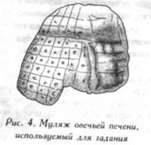Желание заглянуть в будущее было присуще человеку с самых ранних периодов его истории. Наверное, нет в мире такого народа, у которого не нашлось бы верований и магических предписаний, возникших в глубокой древности, направленных на предугадывание будущих событий. Некоторые способы таких предсказаний приводятся ниже. Нельзя не отметить и то, что многие виды гаданий возникали в более позднее время вплоть до современности. Так, гадание на картах Таро распространяется в странах Европы, начиная с XIV века. Однако оккультисты часто утверждают, что эти карты восходят корнями к магии жрецов древнего Вавилона, Египта или даже к давно исчезнувшей Атлантиды. Гадание по чаинкам широко распространилось в XIX веке. Все это свидетельствует о способности человеческой психики искать способы предугадывания событий, независимо от того, в каком веке они живут и насколько в обществе развиты научные представления. В первобытном обществе существовала стойкая вера в судьбу человека и предначертанность событий. От древних земледельцев и охотников дошли до нас различные способы гадания для предсказания результатов охоты, видов на урожай и приплод скота, на предугадывание судьбы отдельного человека. Существовало много разновидностей гадания, или мантики. Гаруспиици - отгадывание судьбы по внутренностям животных, убитых чаще всего во время жертвоприношений. Этот способ гадания с древних времен использовался в ассирийской практике гаданий. В Вавилоне для толкования по внутренностям животных использовались глиняные таблички и муляжи. Сохранилась сделанная из глины овечья печень, которая служила макетом для древневавилонских прорицателей. Поверхность ее разделена на 50 квадратов, и на каждом из них показаны возможные изменения и их значения д\я предсказаний судьбы (рис. 4).