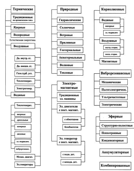Класс – определяется по основному процессу и виду исходной (потребляемой) энергии. Подкласс – определяется по характерным особенностям и принятым (привычным) наименованиям. Группа – определяется по виду производимой (вырабатываемой) энергии. Подгруппа – определяет тип установки по конструктивным отличиям. В зависимости от специфических особенностей и состояния разработок указанное деление не всегда точно может соблюдаться. Основных классов – восемь: 1- термические энергоустановки: в них основной процесс энерговыделения – фазовый переход высшего рода (ФПВР), то есть – частичное или полное расщепление атомов на элементарные частицы – электрино и электроны. Исходная энергия – это потенциальная энергия связи элементарных частиц в атоме – энергия, аккумулированная в веществе. 2- природные энергоустановки, то есть установки, использующие энергию природных явлений непосредственно. 3- кориолисовые энергоустановки – основной процесс производства энергии связан с самораскруткой ротора кориолисовыми силами. Исходная энергия радиального потока вещества может быть различной: гидравлическая, химическая, магнитная,... 4- электромагнитные энергоустановки – основной процесс – преобразование потоков электрино в различные виды энергии: механическую, тепловую, электрическую. 5- виброрезонансные энергоустановки – основной процесс – энергообмен рабочего тела в условиях резонанса колебаний. Исходной является энергия внешней среды, в частности, молекул атмосферного воздуха. 6- эфирные энергоустановки – основной процесс – направленное сгущение эфира, в частности, электринного газа. Исходная энергия – эфира. 7- аккумуляторные энергоустановки – основной процесс – аккумуляция энергии (электрической, химической, тепловой,...) и отдача ее при разряде аккумулятора. 8- комбинированные энергоустановки – установки с несколькими разнотипными процессами энерговыделения, которые затруднительно отнести к одному из указанных классов. В этот класс входят все традиционные энергоустановки на органическом топливе, ядерные, водородные и новые установки естественной энергетики. К традиционным относятся: двигатели внутреннего и внешнего сгорания, газо- и паротурбинные установки, а также различные тепловые, котельные установки. К ядерным относятся современные атомные электро- и теплостанции, на которых процесс энерговыделения идет с полным распадом радиоактивных веществ. Водородные энергоустановки используют водород, который в реакции с кислородом дает воду. Перечисленные энергоустановки достаточно известны и по ним имеется много технической литературы, поэтому нет необходимости их подробно описывать. Следует подчеркнуть, что в них используются ограниченные природные ресурсы: уголь, нефть, газ, уран..., не восполняемые природой так быстро, как они расходуются. Для этих установок характерна ущербная экология, пагубная для человечества. Установки естественной энергетики /1/ свободны от указанных недостатков, так как используют только частичный, щадящий, распад вещества (воздух, вода) без изменения химических свойств вследствие малого дефекта массы порядка 10-6 %, который восполняется в природных условиях. Термоядерные энергоустановки, по которым разработки ведутся уже несколько десятилетий с нулевым результатом, в классификацию не п