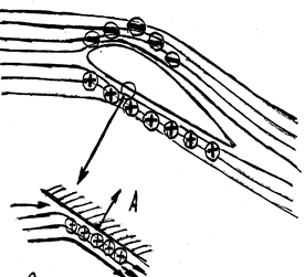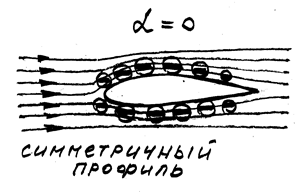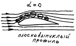 Из-за обтекания выпуклой части профиля поток сжимается, скорость в нём растёт и соответственно падает давление (закон Бернулли). Поэтому на плосковыпуклом профиле при a = 0 возникает разность давлений под крылом и над крылом и появляется подъёмная сила.