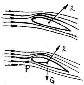 При обтекании крыла когда a > 0 (рис.3), происходит столкновение потока с плоскостью под углом a и он отбрасывается параллельно плоскости, изменяя направление - вниз, при этом возникает сила A — реактивная сила (второй закон Ньютона). Кроме этого, поток, встречая препятствие и изменяя направление движения, несколько тормозится и в нём повышается давление (закон Бернулли). В совокупности с разрежением, возникающим над верхней поверхностью крыла, образуется аэродинамическая сила — R или полная аэродинамическая сила, которая отклонена несколько назад из-за сопротивления воздуха. Полная аэродинамическая сила представляется в виде вектора приложенного в точке, которая называется центром давления (рассмотрим позже). Кроме силы R, на крыло действуют ещё две силы — это сила тяжести G и сила тяги P. Вот собственно эти самые лебедь, рак и щука преследуют самолёт в полёте постоянно и управляя балансом этих зверей, лётчик управляет самолётом.