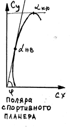 Рис.1 Примеры поляр некоторых самолетов. На поляре можно определить несколько важных параметров: 1. нв (наивыгоднейший) — он соответствует точке соприкосновения касательной из начала координат с полярой. нв — это угол атаки, на котором крыло создаёт максимальную подъёмную силу с минимальным лобовым сопротивлением, он обычно соответствует vнв — наивыгоднейшей скорости, скорости, на которой ЛА выполняет полёт с минимальными энергетическими затратами. 2. Угол наклона касательной — φ. Чем сильнее наклонена касательная, тем меньше аэродинамическое качество ЛА. Аэродинамическим качеством называется отношение подъёмной силы к лобовому сопротивлению. K = Y/X. Обычно, говоря о качестве ЛА, имеют в виду максимальное качество, которое соответствует отношению Y к X на нв или наивыгоднейшей скорости. У спортивных планеров оно достигает 50, у большинства самолётов оно колеблется от 4 до 15. 3. Наивысшая точка поляры соответствует максимальному значению Cy и соответствует кр.