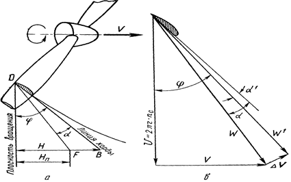 Рис. 11 Угол установки и угол атаки лопастей: а - угол атаки элемента лопасти, б - скорости элемента лопасти