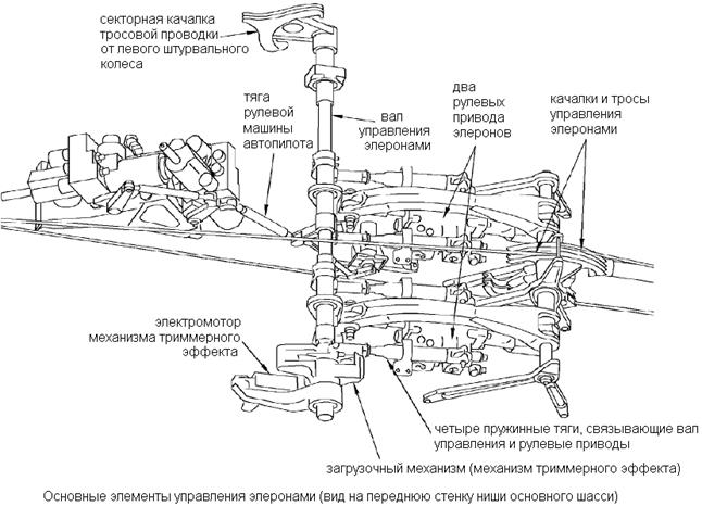 Рулевой привод элеронов соединен тросовой проводкой с левой штурвальной колонкой через загрузочный механизм (aileron feel and centering unit). Данное устройство имитирует аэродинамическую нагрузку на элеронах, при работающем рулевом приводе, а также смещает положение нулевых усилий (механизм триммерного эффекта). Пользоваться механизмом триммерного эффекта элеронов можно только при отключенном автопилоте, поскольку автопилот управляет рулевым приводом напрямую, и будет пересиливать любые перемещения загрузочного механизма. Зато в момент отключения автопилота эти усилия сразу же передадутся на проводку управления, что приведет к неожидаемому кренению самолета. Для управления механизмом триммерного эффекта установлено два переключателя. Один из них определяет сторону смещения нейтрали, а второй включает питание электродвигателя. Триммирование произойдет только при нажатии на оба переключателя одновременно.