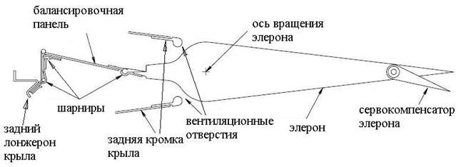 Балансировочные панели представляют собой панели соединяющие переднюю кромку элерона с задним лонжероном крыла с помощью шарнирных соединений. При отклонении элерона, например, вниз - на нижней поверхности крыла в зоне элерона возникает зона повышенного давления, а на верхней – разрежения. Этот перепад давления распространяется в зону между передней кромкой элерона и крылом и, воздействуя на балансировочную панель, уменьшает шарнирный момент элерона.