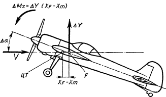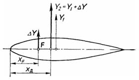 Рис. 13.2 Ообъяснение продольной статической устойчивости самолета по перегрузке Фокусом крыла называется точка, относительно которой момент аэродинамических сил не зависит от угла атаки (Рис.).Аэродинамический фокус принято обозначать буквой F, а его координату буквой ХF.