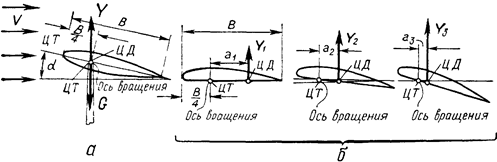 Рис. 13.4 Равновесие крыла относительно оси вращения Фокус крыла - постоянная точка, находится приблизительно на 1/4 длины хорды от передней кромки САХ. Предположим, что крыло с несимметричным профилем установили на ось вращения на 25% САХ от передней кромки. Сбалансируем его так, чтобы ЦТ находился на оси вращения (рис. 13.4, а). При обтекании крыла воздушным потоком подъемная сила Y растет с увеличением угла атаки, и при этом центр давления перемещается по хорде вперед (см. рис13.4, б). Момент подъемной силы крыла стремится повернуть крыло вокруг оси вращения (уменьшить угол атаки). На всех углах атаки этот момент одинаков: Y1a1=Y2a2=Y3a3=..., где a1, a2 и т. д. - расстояния ЦД от ЦТ.