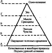 [Надписи (сверху - вниз): Само-сознание; Эго; Мысли, Принципы; Эмоции, Чувства; Ощущение телесных процессов; Естественные и всеобщие процессы; Подъем уровней сознания.] Рис. 46
