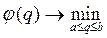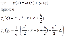 Рис. 1.2. График функции j(q). Графическое представление интересующей нас задачи минимизации средних ожидаемых потерь в рентабельности дает рис. 1.2. На этом рисунке составляющая j1(q) таких потерь представляет собой прямую линию возрастающего типа, а составляющая j2(q) – соответствующую гиперболу. Легко видеть, что функция j(q) (как сумма указанных функций j1(q) и j2(q)) имеет единственную точку минимума qmin, которую находим из уравнения j¢(q) = 0: