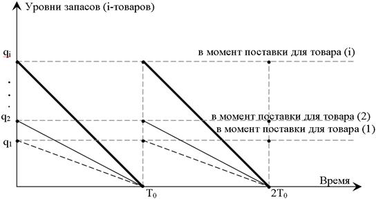 ОСОБЕННОСТЬ модели: учитывается произвольное количество N видов i -товаров (i = Отметим соответствующие атрибуты модели и обозначения: o отсутствие запасов по каждому виду i -товаров недопустимо (i = o спрос на i -товар постоянен; Di – его годовое потребление; o поставки общие; Т0 – интервал повторного заказа; o затраты на хранение единицы i -товара – Chi (зависят от i -товара); o накладные затраты одной поставки – С0 (общие для партии заказа); o объем заказа i -товара – qi (в партии общей поставки); o ежегодное количество поставок – 1/ Т0 (где Т0 – в годах); o средний годовой уровень запаса i -товара – qi/2.
