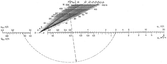 Рисунок 4.3 - Номограмма для определения секундных и часовых расходов воды q при q0 £ 0,3 л/с, N £ 200 и Р > 0,1
