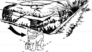 по проходу вслед за танком. Преодоление минного поля по заблаговременно проделанному проходу в случае невозможности применения бронетехники Приблизившись к траншее противника на 30-35 м солдат по команде командира «Гранатой - огонь» или самостоятельно бросает гранату в траншею и стремительным рывком пригнувшись с криком «Ура!» решительно врывается на передний край обороны, уничтожает противника огнем в упор и безостановочно продолжает атаку в указанном направлении. Если солдат вынужден вести бой в траншее или ходе сообщения, то он продвигается как можно быстрее. Перед тем как войти в излом траншеи или хода сообщения, солдат бросает гранату и производит 1-2 очереди из личного оружия («прочесывание огнем»). Осмотр траншеи целесообразно вести вдвоем, причем один из солдат продвигается по траншее, а второй пригнувшись сверху чуть позади, предупреждая солдат в траншее об изгибах и других опасных местах (блиндажах, перекрытых щелях, стрелковых ячейках). Проволочные заграждения в виде «ежей», «рогаток» и т.п., поставленные противником в траншее, выбрасываются наверх примкнутым к автомату штык-ножом, а в случае их минирования обходятся поверх траншеи. Обнаруженные минно-взрывные заграждения обозначаются ярко видимыми знаками (обрывки материи красного или белого цвета) или уничтожаются путем подрывания. Продвигаясь по траншее следует производить как можно меньше шума, применяя для уничтожения противника уколы штык-ножа, удары прикладом, магазином или пехотной лопаткой.
