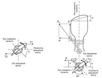 Рис. 2.2. Конструкция воздушного винта Принцип работы. При вращении винта возникают центробежные крутящие моменты, стремящиеся повернуть лопасть в сторону уменьшения угла установки (рис. 2.3, а). К каждой лопасти винта самолета DA 42 прикреплены противовесы, которые обеспечивают компенсацию центробежных крутящих моментов и поворачивают лопасть в сторону увеличения угла установки (рис. 2.3, б). Двигатель оснащен системой электронного управления (FADEС), которая осуществляет регулирование шага винта. Масло из редуктора двигателя закачивается в регулятор постоянства оборотов (РПО), который регулирует подачу масла в винт в соответствии с требуемым шагом винта: давление в цилиндре действует на поршень, поворачивающий лопасти в сторону уменьшения угла установки. Соответственно, для облегчения винта (j лопасти уменьшается) – давление масла увеличивается, для затяжеления винта (j лопасти увеличивается) – давление масла уменьшается.