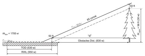 Рис. 4.8. Дистанции необходимые для расчета параметра «d» Таким образом, при конкретных заданных условиях взлета расчет показал, чтобы преодолеть препятствие, необходимо выдерживать вертикальную скорость набора высоты 1,09 м/с.