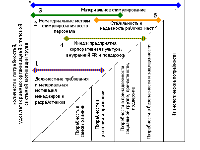 Рис. 3.3. Место и роль факторов стимулирования труда Материальные методы (линия 3) — стимулирование активности работника, конкурентный уровень оплаты труда, поддержка при значимых событиях в жизни работника, подарки, материальная помощь в критические моменты жизни, страхование на существенные суммы, оплата лекарств и т.д. Имиджевые рычаги (PR, линия 4) — общий имидж компании, статус работника успешного современного предприятия, престиж работы, корпоративные мероприятия и праздники. Организационные рычаги (линия 5) — информирование общественности о долгосрочных перспективах деятельности компании, обучение персонала, придание стабильности рабочим местам и перспектив профессионального роста. Потребность в безопасности и защите. Важный фактор, существенно влияющий на лояльность работника, его приверженность организации и стойкость в критические периоды. Для управления этой потребностью требуется применять: Материальные методы (линия 3) — конкурентный уровень оплаты труда, позволяющий делать страховые материальные сбережения, «белая» зарплата (позволяющая привлекать долгосрочные кредиты — но это отдельная тема), поддержка при значимых событиях в жизни работника, подарки, материальная помощь в критические моменты жизни, страхование на существенные суммы, оплата лекарств и т.д. Имиджевые рычаги (PR, линия 4) — общий узнаваемый общественностью имидж сильной и динамичной компании, прижизненный почетный общественный статус работника успешного современного предприятия и его поддержка, корпоративные мероприятия и праздники. Организационные рычаги (линия 5) — информирование общественности и коллектива о долгосрочных перспективах деятельности компании, обучение персонала, придание стабильности рабочим местам и перспектив профессионального роста. Физиологические потребности. Основа для заключения трудовых соглашений. При этом необходимо понимать, что под термином «физиологические потребности» должно пониматься нечто большее, чем условия концлагеря или ИТУ. Цивилизация существенно увеличила те потребности, которые у Маслоу получили наименование «физиологических». Более того, существует разделение таких потребностей по странам и регионам. Для современного определения таких потребностей следует использовать понятие «социального статуса» работника определенной квалификации с учетом исторически сложившихся условий на конкретном рынке труда. Но это уже другая история, не входящая в круг рассматриваемых вопросов. Для управления этой потребностью следует: Формировать материальное стимулирование (линия 3) таким образом, чтобы средняя материальная оценка труда работника не была ниже существующей на рынке для специалиста его квалификации. Есть и иной подход, связанный с рыночным определением материальной составляющей мотивации. Если взять объем работ, требуемый компанией за 100%, то исполнение 75% должно оплачиваться в пределах среднерыночной стоимости специалиста. Иначе говоря, среднее исполнение (по объему и качеству) работ, должно соответствовать среднему уровню зарплаты такого специалиста. Резерв по объему работ, и, соответственно, оплаты труда позволит, создать здоровую конкуренцию и привлекать тех, кто готов выполнять 100 и более %%, зарабатывая, при этом, больше, чем аналогичный специалист в другой компании. Не