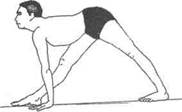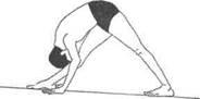 Баддха хаста паршвоттанасана - уберите ладони с талии и поставьте кончики пальцев рук на пол с обеих сторон от правой стопы. Следите, чтобы ноги и руки были выпрямлены, а таз — параллелен полу; - поднимите голову, прогните спину и посмотрите вверх; - вдохните, поднимитесь; - теперь повторите все действия в левую сторону. ПРИМЕЧАНИЕ: если кисти рук не достают до пола, поставьте бруски по обе стороны от стопы и поместите на них ладони. b) голова вниз - следуйте технике а), разворачиваясь вправо; - выдохните и опустите туловище вниз так, чтобы живот приблизился к правому бедру; - опустите голову на голень; - вдохните, поднимите голову и туловище, вернитесь в Уттхита хаста падасану, руки на талии; - теперь выполните асану в другую сторону. ИЗУЧАЙТЕ эти движения, разбивая действие на 3 этапа и отрабатывая каждое из них поочередно вправо и влево: 1) ладони на талии, разворот туловища, голова назад; 2) кисти на полу, прогиб в спине; 3) голова вниз. Выучите эти движения и выполняйте их последовательно и слитно как вправо, так и влево. c) Баддха мани бандха паршвоттанасана — захват запястья за спиной, голова вниз. Чтобы выполнить Пасчима намаскарасану, выполните следующие действия: - захватите правое запястье левой кистью за спиной и следуйте движениям, описанным выше; - теперь захватите левое запястье правой кистью и повторите движения еще раз. d) Баддха хаста паршвоттанасана — захват рук. - согните левую руку и захватите верхнюю часть правой руки и локоть, потом согните правую руку и захватите верхнюю часть левой руки и локоть за спиной; - выполните асану, как описано выше; - чтобы выполнить конечное положение, правой рукой захватите верхнюю часть левой руки и локоть, а левой рукой захватите правую; e) Пасчиманамаскара— голова вниз - из Самастхити выполните Пасчима намаскарасану Глава 1. Асаны в положении стоя 37