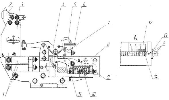 1 – связи гибкие; 2 – наконечник контактный; 3 – контакт подвижный; 4 – якорь; 5 – скоба; 6 – кольца медные; 7 – магнитопровод; 8 – шина выводная; 9 – тяга; 10 – пружина; 11 – рычаг; 12 – шкала; 13 – контргайка; 14 – указатель Рисунок 3.5 - Отключающий электромагнит