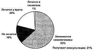 Изучение предложенной схемы позволяет сделать следующие выводы: 16% — не испытывают потребности в каком-либо лечении; 21% — посещают врача-аллопата в его кабинете или в госпитале; 63% — занимаются самолечением. Приведенные данные можно прокомментировать следующим образом: только 20% больных приходят к врачу-аллопату. В этом случае 80% избегают всяких встреч с терапевтом и со специалистами. Если, как известно, 1% приходит на консультацию в госпиталь, то 79% человек даже при появлении симптома болезни отказываются от всякой консультации! Из 79%, которые игнорируют консультации, 16% не обращают никакого внимания на появление симптомов заболевания. Почему? Можно предположить, что за рассматриваемый период времени эта группа больных была плохо проинформирована с профилактической точки зрения, испытывала чувство страха от посещения врача или боялась признать, что состояние их здоровья потребует лечения, или это было просто-напросто проявлением их личной небрежности. Почему 63% людей занимаются самолечением? Можно предположить, что болезнь рассматривается ими как безобидная вещь и что средства лечения им хорошо известны. Поэтому они не беспокоят врача и не затрудняют себя посе-