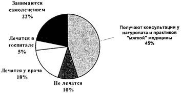 щением консультационного кабинета. Стоимость посещения врача также неблагоприятно сказывается на появлении желания его посетить. Но не всегда речь идет о стоимости финансовой. Чаще всего пациенту жалко потерянного времени при ожидании в приемной врача, получение больничного листка может повлиять на его авторитет на службе. Речь может также идти о психологической и социальной нагрузке. Врач рассматривается как "высшее существо", обладающее объемом специфических знаний. Перед ним испытываешь смущение и неловкость, а порой и замешательство. То есть складывается ситуация, которая ставит больного в униженное положение. "Обходиться без врача – это значит утвердиться в положении свободного, независимого и автономного человека", — утверждали М. Рейно и А.Ж. Кудер ("Опыты лечебного искусства", издательство "Синапс", Фризон-Рош, 1987 г.). По сравнению с 60—70 гг. ситуация значительно изменилась. Из 63% человек, практиковавших прежде самолечение, и тех 16%, не затруднявших себя абсолютно никаким лечением, найдутся ли и сейчас те, которые не захотели бы с руками и ногами отдать себя во власть медицинского корпуса? Это именно тот вопрос, который мы вправе теперь задать. Схема, предложенная Джоном Фри в 1973 г., теперь уже не соответствует действительности. Он не задал себе вопроса о том, почему только 21 % больных шли на консультацию к врачу, он придавал в своем исследовании слишком большое внимание людям, которые занимаются самолечением. Серьезный современный кризис уже на марше. Никто в медицинском мире не мог предвидеть, что он трансформируется в катастрофу. С 1970 по 1993 г. медицина, придерживающаяся природных методов лечения, постоянно прогрессировала благодаря хорошо организованной информации населения об этом новом направлении терапевтического воздействия. Число натуропатов и других сторонников "мягкой", альтернативной медицины продолжало увеличиваться в пропорции 1 к 30 или даже к 40. Учитывая развитие сложившейся ситуации, к концу 1993 г. я предложил следующую схему: