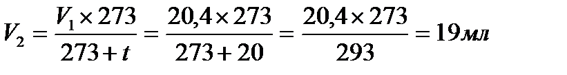 где Р0 и Р — давления газа соответственно при температурах 0°С и t°С. При замене шкалы Цельсия шкалой Кельвина, связь между которыми устанавливается соотношением Т = 273 + t, формулы законов Гей-Люссака и Шарля значительно упрощаются. Закон Гей-Люссака: при постоянном давлении объем данной массы газа прямо пропорционален его абсолютной температуре: Закон Шарля: при постоянном объеме давление данной массы газа прямо пропорционально его aбcoлютной температуре: Из законов Гей-Люссака и Шарля следует, что при постоянном давлении плотность и концентрация газа обратно пропорциональны его абсолютной температуре: где d1 и С1 — плотность и концентрация газа при абсолютной температуре Т1, d2 и C2 —соответствующие величины при абсолютной температуре Т2. Пример 2 Пpи 20ºC объем газа равен 20,4 мл. Какой объем займет газ при его охлаждении до 0°С, если давление остается постоянным?