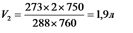 Объединенный закон Бойля- Мариотта — Шарля – Гей-Люссака Формулировка этого закона: для данной массы газа произведение давления на объем, деленное на абсолютную температуру, постоянно при всех изменениях, происходящих с газом. Математическая запись: где V1 — объем и Р1 — давление данной массы газа при абсолютной температуре Т1, V2 — объем и P2 — давление той же массы газа при абсолютной температуре Т2. Одним из важнейших применений объединенного закона газового состояния является „приведение объема газа к нормальным условиям". Пример 3. Газ при 15°С и давлении 760 мм рт. ст. занимает объем 2 л. Привести объем газа к нормальным условиям.