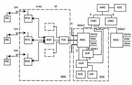 Рис. 1.1 Функциональное построение и интерфейсы, принятые в стандарте GSM, иллюстрируются структурной схемой рис, 1.1, на которой MSC (Mobile Switching Centre) - центр коммутации подвижной связи; BSS (Base Station System) - оборудование базовой станции; ОМС (Operations and Maintenance Centre) - центр управления и обслуживания; MS (Mobile Stations) - подвижные станции. Функциональное сопряжение элементов системы осуществляется рядом интерфейсов. Все сетевые функциональные компоненты в стандарте GSM взаимодействуют в соответствии с системой сигнализации МККТТ SS N 7 (CCITT SS. N 7). Центр коммутации подвижной связи обслуживает группу сот и обеспечивает все виды соединений, в которых нуждается в процессе работы подвижная станция. MSC аналогичен ISDN коммутационной станции и представляет собой интерфейс между фиксированными сетями (PSTN, PDN, ISDN и т.д.) и сетью подвижной связи. Он обеспечивает маршрутизацию вызовов и функции управления вызовами. Кроме выполнения функций обычной ISDN коммутационной станции, на MSC возлагаются функции коммутации радиоканалов. К ним относятся "эстафетная передача", в процессе которой достигается непрерывность связи при перемещении подвижной станции из соты в соту, и переключение рабочих каналов в соте при появлении помех или неисправностях. Каждый MSC обеспечивает обслуживание подвижных абонентов, расположенных в пределах определенной географической зоны (например, Москва и область). MSC управляет процедурами установления вызова и маршрутизации. Для телефонной сети общего пользования (PSTN) MSC обеспечивает функции сигнализации по протоколу SS N 7, передачи вызова или другие виды интерфейсов в соответствии с требованиями конкретного проекта. MSC формирует данные, необходимые для выписки счетов за предоставленные сетью услуги связи, накапливает данные по состоявшимся разговорам и передает их в центр расчетов (биллинг-центр). MSC составляет также статистические данные, необходимые для контроля работы и оптимизации сети. MSC поддерживает также процедуры безопасности, применяемые для управления доступами к радиоканалам. MSC не только участвует в управлении вызовами, но также управляет процедурами регистрации местоположения и передачи управления, кроме передачи управления в подсистеме базовых станций (BSS). Регистрация местоположения подвижных станций необходима для обеспечения доставки вызова перемещающимся подвижным абонентам от абонентов телефонной сети общего пользования или других подвижных абонентов. Процедура передачи вызова позволяет сохранять соединения и обеспечивать ведение разговора, когда подвижная станция перемещается из одной зоны обслуживания в другую. Передача вызовов в сотах, управляемых одним контроллером базовых станций (BSC), осуществляется этим BSC. Когда передача вызовов осуществляется между двумя сетями, управляемыми разными BSC, то первичное управление осуществляется в MSC. В стандарте GSM также предусмотрены процедуры передачи вызова между сетями (контроллерами), относящимися к разным MSC. Центр коммутации осуществляет постоянное слежение за подвижными станциями, используя регистры положения (HLR) и перемещения (VLR). В HLR хранится та часть информации о местоположении какой-либо подвижной станции, которая позволяет центру коммутации доставить вызов станции. Регистр HLR содержит международный идентификационный номер подвижного абонента (IMSI). Он исп