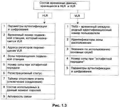 Практически HLR представляет собой справочную базу данных о постоянно прописанных в сети абонентах. В ней содержатся опознавательные номера и адреса, а также параметры подлинности абонентов, состав услуг связи, специальная информация о маршрутизации. Ведется регистрация данных о роуминге (блуждании) абонента, включая данные о временном идентификационном номере подвижного абонента (TMSI) и соответствующем VLR. К данным, содержащимся в HLR, имеют дистанционный доступ все MSC и VLR сети и, если в сети имеются несколько HLR, в базе данных содержится только одна запись об абоненте, поэтому каждый HLR представляет собой определенную часть общей базы данных сети об абонентах. Доступ к базе данных об абонентах осуществляется по номеру IMSI или MSISDN (номеру подвижного абонента в сети ISDN). К базе данных могут получить доступ MSC или VLR, относящиеся к другим сетям, в рамках обеспечения межсетевого роуминга абонентов. Второе основное устройство, обеспечивающее контроль за передвижением подвижной станции из зоны в зону, - регистр перемещения VLR. С его помощью достигается функционирование подвижной станции за пределами зоны, контролируемой HLR. Когда в процессе перемещения подвижная станция переходит из зоны действия одного контроллера базовой станции BSC, объединяющего группу базовых станций, в зону действия другого BSC, она регистрируется новым BSC, и в VLR заносится информация о номере области связи, которая обеспечит доставку вызовов под- Состав временных данных, хранящихся в HLR и VLR