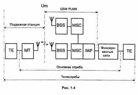 Стандарт GSM содержит два класса служб: основные службы и телеслужбы. Основные службы обеспечивают: передачу данных (асинхронно) в дуплексном режиме со скоростями 300, 600, 1200, 2400, 4800 и 9600 бит/с через телефонные сети общего пользования; передачу данных (синхронно) в дуплексном режиме со скоростями 1200, 2400, 4800 и 9600 бит/с через телефонные сети общего пользования, коммутируемые сети передачи данных общего пользования (CSPDN) и ISDN; доступ с помощью адаптера к пакетной асинхронной передаче данных со стандартными скоростями 300-9600 бит/с через коммутируемые сети пакетной передачи данных общего пользования (PSPDN), например, Datex-P; синхронный дуплексный доступ к сети пакетной передачи данных со стандартными скоростями 2400-9600 бит/с [1.1, 1.2]. При передаче данных со скоростью 9,6 кбит/с всегда используется канал связи с полной скоростью передачи. В случае передачи на скоростях ниже 9,6 кбит/с могут использоваться полускоростные каналы связи. Перечисленные функции каналов передачи данных предусмотрены для терминального оборудования, в котором используются интерфейсы МККТТ со спецификациями V.24 или Х.21 серий. Эти спецификации определяют вопросы передачи данных по обычным каналам телефонной связи. Телеслужбы предоставляют следующие услуги: 1) телефонная связь (совмещается со службой сигнализации: охрана квартир, сигналы бедствия и пр.); 2) передача коротких сообщений; 3) доступ к службам "Видеотекс", "Телетекс"; 4) служба "Телефакс" (группа 3). Дополнительно стандартизован широкий спектр особых услуг (передача вызова, оповещения о тарифных расходах, включение в закрытую группу пользователей). Так как ожидается, что большинство абонентов будет использовать услуги GSM в деловых целях, особое внимание уделяется аспектам безопасности и качеству предоставляемых услуг. Структурная схема служб связи в GSM PLMN показана на рис. 1.4 (GSM PLMN - GSM Public Land Mobile Network - сеть связи с наземными подвижными объектами; ТЕ (Terminal Equipment) -терминальное оборудование, МТ (Mobile Terminal) - подвижный терминал, IWF (Interworking Function) - межсетевой функциональный стык). К передаче данных относится и новый вид службы, используемый в GSM, - передача коротких сообщений (передача служебных буквенно-цифровых сообщений для отдельных групп пользователей).