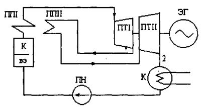 Промежуточный перегрев пара является одним из способов повышения степени его сухости. Принципиальная схема цикла Ренкина с промежуточным перегревом пара дана на рис. 4.1. В этой схеме предусмотрены две ступени турбины ПТ-I, ПТ-II и две ступени пароперегревателя ПП-I, ПП-II. Пар после первой ступени пароперегревателя ПП-I направляется в первую ступень турбины ПТ-I. Отработавший на лопатках первой ступени турбины пар направляется во вторую ступень пароперегревателя ПП-II, где его температура повышается до начальной температуры T 1. Затем пар поступает на лопатки второй ступени турбины ПТ-II.