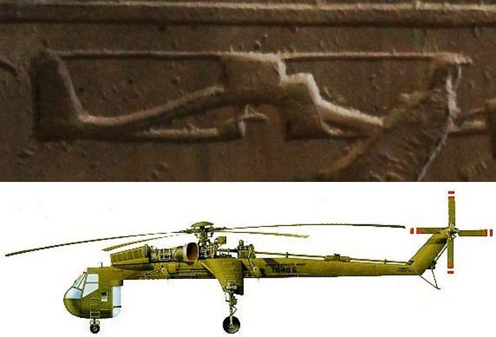 При каких-либо других обстоятельствах подобное заявление вполне могло вызвать лишь искреннее недоумение читателей. Однако опубликованные газетой фотоснимки барельефов храма, построенного более трех тысяч лет назад, буквально вызвали шок. Этого не могло быть, но это было на самом деле!.. Понятно, почему в середине XIX века археологи не обратили на эту «надпись» особого внимания – в это время еще не было подобной техники и сравнивать было просто не с чем. Детали барельефа посему и не могли вызвать никаких столь сенсационных ассоциаций. Но и после этой публикации странная «надпись» могла бы так и остаться в относительной безвестности, если бы на берега Нила не отправился британский писатель Алан Элфорд, который интересовался религией и мифологией Древнего Египта, но при этом абсолютно не сковывал себя взглядом лишь официальной египтологии. Он исследовал странную «надпись» в храме Сети I и убедился в полной реальности того, что еще недавно казалось совершенно невероятным. Элфорд сообщил в интервью журналистам, что древние египтяне изобразили боевой вертолет с удивительной достоверностью – так, как будто делали рисунок с натуры. Эту идею Элфорд представил также в своей книге под названием «Боги нового тысячелетия», которая увидела свет в 1996 году и вскоре разошлась по многим странам мира. О «надписи» на архитраве в Абидосе узнала широкая публика, которая уже не ограничивалась лишь читателями арабской газеты. Почему Элфорд обратил внимание именно на «вертолет»? Дело в том, что одна «фигура» не поддавалась более-менее точной идентификации. Нельзя было однозначно сказать, на что она похожа – на танк или на подводную лодку, а кое-кто видел в ней и дирижабль. «Самолет» выглядит как-то уж сильно стилизовано, хотя и уже узнаваемо. А вот «вертолет» изображен куда более похоже на реальный – с явно различимыми лопастями несущего винта и хвостового оперения. Наличие же рядом на одном архитраве сразу трех изображений современных транспортных средств серьезно усиливает эффект. Некоторых смущало, правда, наличие странного прямоугольного «выреза» на кабине «вертолета». Но достаточно быстро были найдены современные аналоги именно с этой особенностью формы. Ими оказались грузовые транспортные вертолеты – например, вертолет Сикорского S60 и дальнейшие его модификации. Аналоги этим «летающим грузовым стрекозам» имелись и в Советском Союзе, хотя они и были меньше похожи на абидосское изображение.