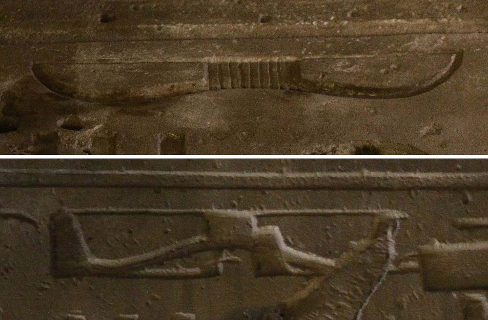 Она, правда, отличается от того, что считается наложением, в той части, которая находится левее изображения лука, но это вполне можно было бы объяснить перечислением разных титулов фараона. Однако проблема вовсе не в этом. Дело в том, что возникает очень «неудобный» вопрос – если фараон Рамзес II заменял титулы своего отца на свои, то почему оставил надпись на этом архитраве без изменений?.. Как-то нелогично получается. Может, не хватило времени?.. Но такой вариант не проходит. Как утверждают египтологи, Рамзес II был фараоном, который дольше всех других известных фараонов правил Египтом и дожил до глубокой старости. Так что времени у него было предостаточно. В-третьих. Смена надписей практиковалась в тех случаях, когда надо было добиться забвения предыдущего правителя. Это, конечно же, чаще всего имело место либо в тех случаях, когда смена власти происходила путем переворота, либо, когда к власти приходил тот, кто сильно конфликтовал со своим предшественником. Ни то, ни другое не подходит к паре Сети I – Рамзес II. Сети I заранее и тщательно готовил своего сына к передаче власти. Об этом повествует масса текстов и рисунков на стенах того же храма. Более того, еще задолго до своей кончины Сети I не только провозгласил Рамзеса II своим преемником, но и разделил с ним трон – в Египте было одновременно два соправителя. И ни о каком-либо конфликте между отцом и сыном ни один египтолог до сих пор не высказывал даже предположения. Скорее наоборот – исследователи сходятся в том, что между Сети I и Рамзесом II были прекрасные отношения. Но в таких случаях обычно вовсе не стараются уничтожить память о своем предшественнике, а делают прямо противоположное – стремятся возвеличить предыдущего правителя, что лишь добавляет величия преемнику. И между прочим, храм в Абидосе считается выстроенным Рамзесом II в честь Сети I (по другой версии, Сети I начал строить этот храм, а Рамзес II продолжил строительство). Если это так, то наложение надписей – вообще полный абсурд. Кто бы стал менять на свое имя того, в честь кого он и строит что-то?.. Да еще и в том самом сооружении, которое строится как раз в честь предшественника… В-четвертых. Какова вероятность получения сразу трех «техногенных» изображений в результате случайного наложения двух групп иероглифов?.. Она просто ничтожна… И наконец, посмотрим на детали самих якобы наложенных друг на друга надписей. Я не настолько силен в египетском иероглифическом письме, чтобы подвергать сомнению правильность перевода значков, указываемых в версии наложения надписей. Но в данном случае это и не потребуется. Вместо этого сравним изображение лука в неповрежденном титуле Сети I (на другом архитраве) с изображением «вертолета», которое якобы было получено путем наложения дополнительных иероглифов на изображение такого же лука. К сожалению, сфотографировать архитрав с неповрежденным титулом Сети I под более удобным для сравнения углом невозможно – отойти чуть дальше мешает стена храма. Приходится довольствоваться тем, что есть. Но и этого вполне достаточно.