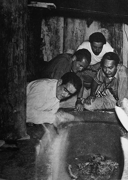 Обследуя плиту, Рус заметил, что стены храма уходят ниже уровня пола, а это с большой вероятностью указывало на то, что внизу имеется еще одна постройка. Вскоре после того, как плиту подняли, археологи обнаружили под ней начало туннеля и несколько ступенек каменной лестницы, которая вела вниз на непонятную глубину. Рус понял, что не ошибся в выборе места исследований... Однако туннель оказался довольно плотно забит большими камнями, щебенкой и землей. И хотя он опускался лишь с вершины пирамиды к ее основанию, на то, чтобы достичь конца туннеля, потребовалось целых четыре полевых сезона по 2-3 месяца археологических работ. За все это время было расчищено два пролета лестницы с 66 ступеньками. Дабы не вносить искажений в информацию, которая нам пригодится в дальнейшем, приведу просто цитату: «В самом начале археологи нашли тайник с ритуальными приношениями в виде двух нефритовых колец, служивших у древних майя украшениями для ушей. Другое приношение лежало у подножия лестницы, в специальном каменном ящичке: ожерелья из нефритовых бус, большие раковины, наполненные красной краской, глиняные вазы и громадная жемчужина диаметром 13 миллиметров. Дальше путь был закрыт поперечной каменной стеной. Когда ее сломали, то вновь пришлось разбирать завалы из сцементированного известковым раствором щебня. В конце концов коридор уперся в какую-то подземную камеру, вход в которую преграждала необычайная, но вполне надежная «дверь» – гигантский треугольный камень весом более тонны. У входа в камеру в некоем подобии гробницы лежали плохо сохранившиеся скелеты пяти юношей и одной девушки, погибших насильственной смертью. Искусственно деформированная лобная часть черепа и следы инкрустаций на зубах говорят о том, что это не рабы, а представители знатных майяских фамилий, принесенные в жертву по какому-то особенно важному и торжественному случаю. Только теперь Русу стало ясно, что все потраченные усилия не были напрасными» (В.И. Гуляев, «Древние Майя. Загадки погибшей цивилизации»). 15 июня 1952 года подошло время апофеоза – рабочие сдвинули с места массивную треугольную плиту, которая загораживала проход в погребальную камеру, и Рус смог бросить взгляд внутрь неизведанного помещения. Позднее он так описывал свои ощущения: «Из густого мрака неожиданно возникла сказочная картина фантастического неземного мира. Казалось, что это большой волшебный грот, высеченный во льду. Стены его сверкали и переливались, словно снежные кристаллы в лучах солнца. Как бахрома огромного занавеса, висели изящные фестоны сталактитов. А сталагмиты на полу выглядели, словно капли воска на гигантской оплывшей свече. Гробница напоминала заброшенный храм. По ее стенам шествовали скульптурные фигуры из алебастра. Потом мой взор упал на пол. Его почти полностью закрывала огромная, прекрасно сохранившаяся каменная плита с рельефными изображениями. Глядя на все это с благоговейным изумлением, я пытался описать красоту волшебного зрелища моим коллегам. Но они не верили до тех пор, пока, оттолкнув меня в сторону, не увидели эту великолепную картину своими собственными глазами. Мы были первыми, кто увидел гробницу тысячу лет спустя!» Погребальная камера, в которую попал Рус, представляла собой прямоугольное помещение с наклонными сводами. На стенах были изображены девять пе