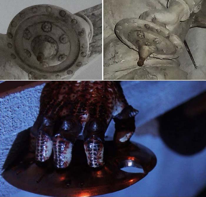 Вроде бы ничего особенного. Меч в руке архангела самый обычный – как и положено, средневековый, в духе времени. Как скульптор мог себе его представить, так и изобразил… Но Игорь Левашов, исследователь из Санкт-Петербурга, обратил внимание на странный щит, который архангел Михаил держит в левой руке. Для щита он слишком мал. Это скорее пародия на щит, поскольку защищаться им от удара меча типа такого, который имеется у самого архангела, фактически невозможно. Да и держит этот щит архангел как-то странно – расставленными в стороны пальцами, а не всей кистью. Обычный щит так не удержать вообще даже при не очень сильном ударе. Зато этот щит чем-то напоминает… «летающую тарелку»!.. Или оружие в виде диска, которое имелось в распоряжении инопланетных охотников, прилетавших на Землю на своеобразное сафари в фантастическом фильме «Хищник».