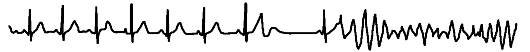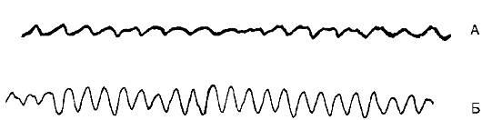 Приобретенный синдром связан с употреблением некоторых лекарственных препаратов, врожденный - с мутациями генов, кодирующих структуру полипептидной цепочки быстрого Na+- канала или двух типов К+-каналов. Известно, что деполяризация кардиомиоцитов начинается с быстрой активации Na+-каналов, которая сменяется такой же быстрой их инактивацией. Весь цикл занимает несколько миллисекунд. Мутация гена, кодирующего белок Na+-канала, приводит к замедлению процесса инактивации этого канала. В результате возникает перегрузка кардиомиоцитов ионами Na, тормозится процесс восстановления нормального градиента ионов и замедляется реполяризация кардиомиоцитов. Эти события могут индуцировать появление желудочковых аритмий по механизму ранней постдеполяризации и проявляются на ЭКГ удлинением интервала Q-T. Как известно, процесс реполяризации обеспечивается К+-каналами, которые при этом открываются. В настоящее время идентифицированы два гена, мутация которых приводит к инактивации этих каналов, что ведет к замедлению реполяризации. Наследственная форма синдрома long Q-T встречается достаточно редко. Фибрилляция (и трепетание) желудочков - это хаотическое асинхронное возбуждение отдельных мышечных волокон или их небольших групп с остановкой сердца и прекращением кровообращения. Эти аритмии представляют наибольшую опасность, так как они при отсутствии экстренных мероприятий в течение 3-5 мин могут привести к летальному исходу. Электрокардиологически фибрилляция желудочков характеризуется появлением волн низкой амплитуды (менее 0,2 мВ) и различной формы с частотой от 300 до 600 в мин (рис. 15-17). Трепетание желудочков характеризуется на ЭКГ появлением волн с нерегулярными большими осцилляциями при частоте 150-300 в мин. При данных аритмиях невозможно выделить