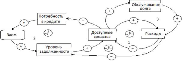Модель состоит из трех контуров. Первый контур (справа, внутренний): «расходы – доступные средства». Чем больше доступные средства – тем больше расходы (связь усиливающая), чем больше расходы, тем меньше доступные средства (связь уравновешивающая). Второй контур (слева): чем меньше доступных средств, тем выше потребность в кредите. Высокая потребность в кредите обусловливает большой объем займа. Большой займ значительно повышает уровень задолженности, повышение уровня задолженности увеличивает объем доступных средств, которые направляются на покрытие расходов. Третий контур (справа внешний): чем больше денег заимствованно, тем дороже обслуживание долга (долг + проценты). Обслуживание долга связано с дополнительными расходами, которые ведут к уменьшению уровня задолженности.
